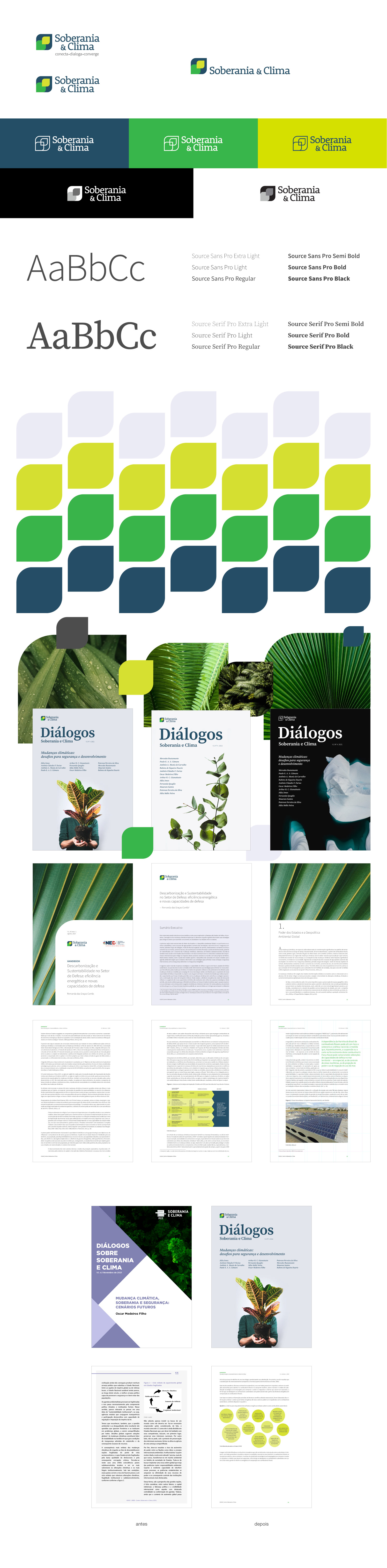 A partir da identidade visual pré-existente, fui chamado para desenvolver os materiais do grupo. Iniciamos pelo projeto gráfico da revista Diálogos Soberania e Clima, publicação acadêmica de periodicidade bimestral. Com o sucesso do projeto, desde então assumi a diagramação para os números posteriores da revista. A revista teve publicações irmãs como relatórios, handbooks e a edição especial que reúne os principais textos publicados no ano. Cada publicação recebeu tratamento e projeto gráfico próprios, ampliando a linha editorial.